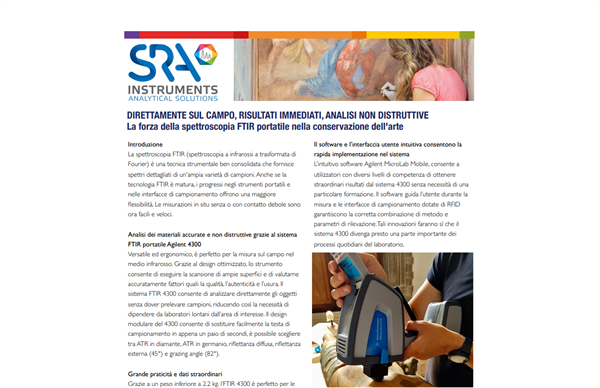 Analisi dei materiali accurate e non distruttive, grazie al sistema FTIR portatile Agilent 4300;  versatile ed ergonomico è lo strumento perfetto per la misura sul campo nel medio infrarosso. Il design ottimizzato consente di eseguire la scansione di ampie superfici e di valutarne accuratamente fattori quali: qualità, autenticità e usura.