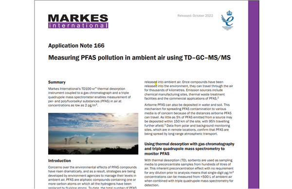 Il sistema per desorbimento termico TD100-xr™ di Markes International, abbinato a un gascromatografo e a uno spettrometro di massa a triplo quadrupolo, consente la misurazione di sostanze perfluoroalchiliche e polifluoroalchiliche (PFAS) nell'aria a concentrazioni fino a 2 pg/m³.
