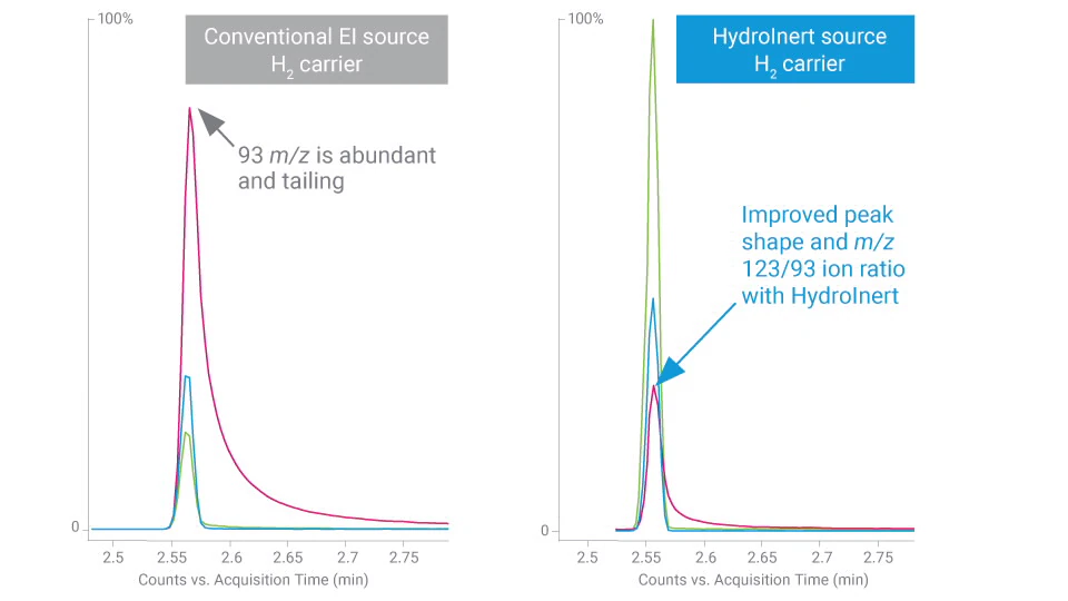 The Agilent HydroInert Source is a GC/MS ion source that improves chromatographic performance when using hydrogen as carrier gas in GC/MS. It helps to avoid loss of sensitivity and spectral anomalies, while offering a high-boiler peak shape. The Agilent HydroInert source reduces the need for GC/MS ion source cleaning, decreasing system downtime and maintenance and resulting in fewer interruptions to data generation.