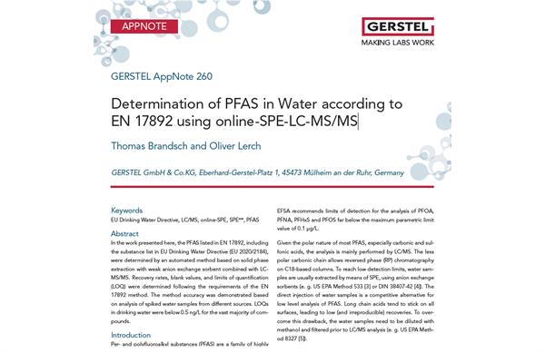 In the work presented here, the PFAS listed in EN 17892, including the substance list in EU Drinking Water Directive (EU 2020/2184), were determined by an automated method based on solid phase extraction with weak anion exchange sorbent combined with LC- MS/MS.