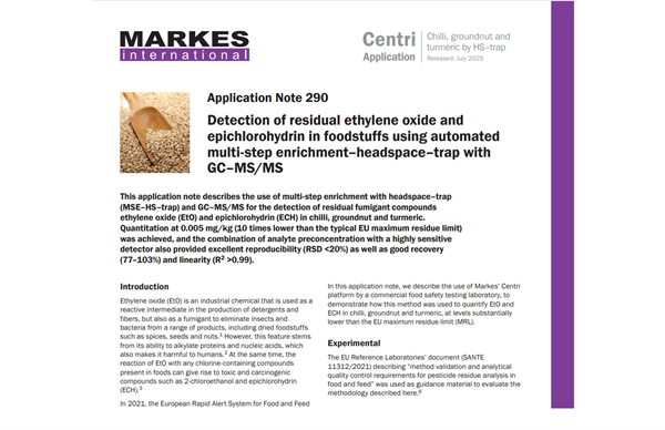 In questa nota applicativa, descriviamo l'utilizzo della piattaforma Centri di Markes da parte di un laboratorio commerciale di analisi per la sicurezza alimentare, per dimostrare come questo metodo sia stato utilizzato per quantificare EtO ed ECH in peperoncino, arachidi e curcuma, a livelli sostanzialmente inferiori al limite massimo di residui (LMR) imposto dall'UE.